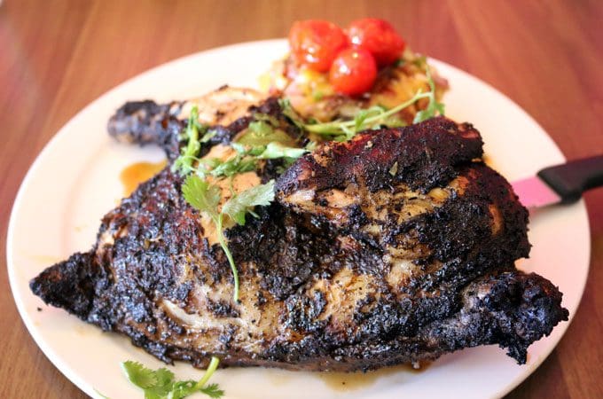 16 July 2016: Absent from the revamped menu are several favorites, but my sense of loss is mitigated by the addition of Caribbean Chicken, among the very best I’ve ever had. Caribbean chicken isn’t synonymous with jerk chicken. In fact, Pasion’s Caribbean chicken doesn’t have a piquant punch. Its flavor profile is derived from non-jerk Caribbean adobo spices and from having been wrapped and roasted in banana leaves which seal in freshness and flavor. This is outrageously good chicken–two thighs and two legs. The chicken is served with a white rice and mashed ripe plantain mound, a surprisingly good combination.