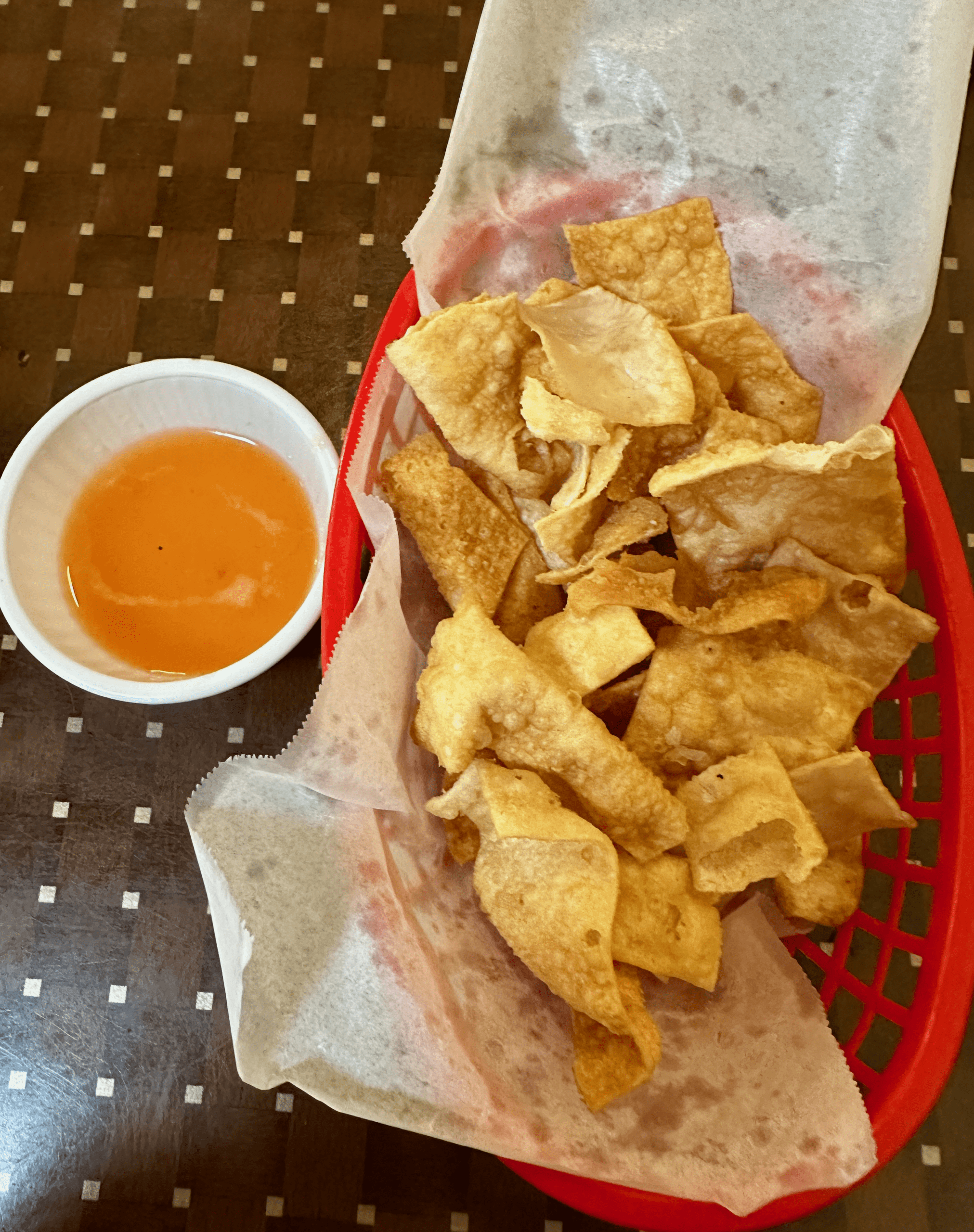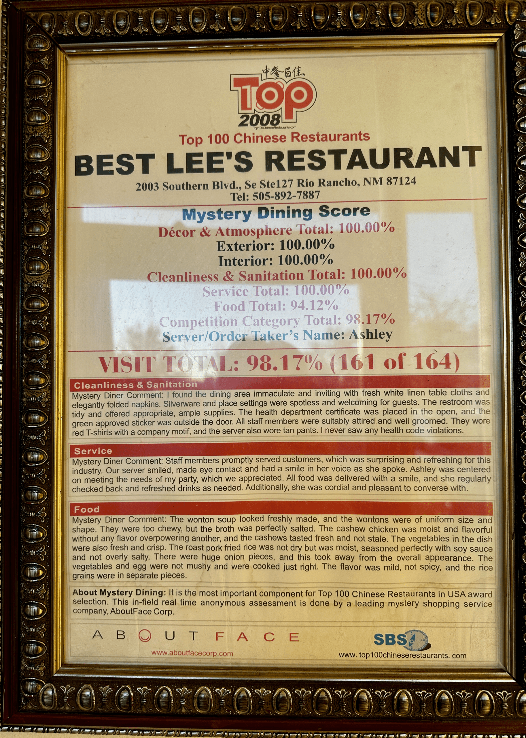 The restaurant is somewhat austere in its decor with just a few silk and sandalwood fans and stereotypical examples of three-dimensional Chinese art hanging on the wall. Chinese lanterns hang from the ceiling, but there really isn’t anything “eye-catching” to hold your interest. That’s within the restaurant itself. At the foyer, you’ll espy a framed certificate from the Top 100 Chinese Restaurants site (yes, there is such a thing). Best Lee’s earned a 98.17 score during a “mystery dining” experience from Top 100. You might ponder that as you enjoy the complimentary wonton chips brought to your table while you peruse the menu. The chips are somewhat oily and don’t fare that well with the contrasting taste of Lee’s sweet-and-sour sauce which accompanies them.
