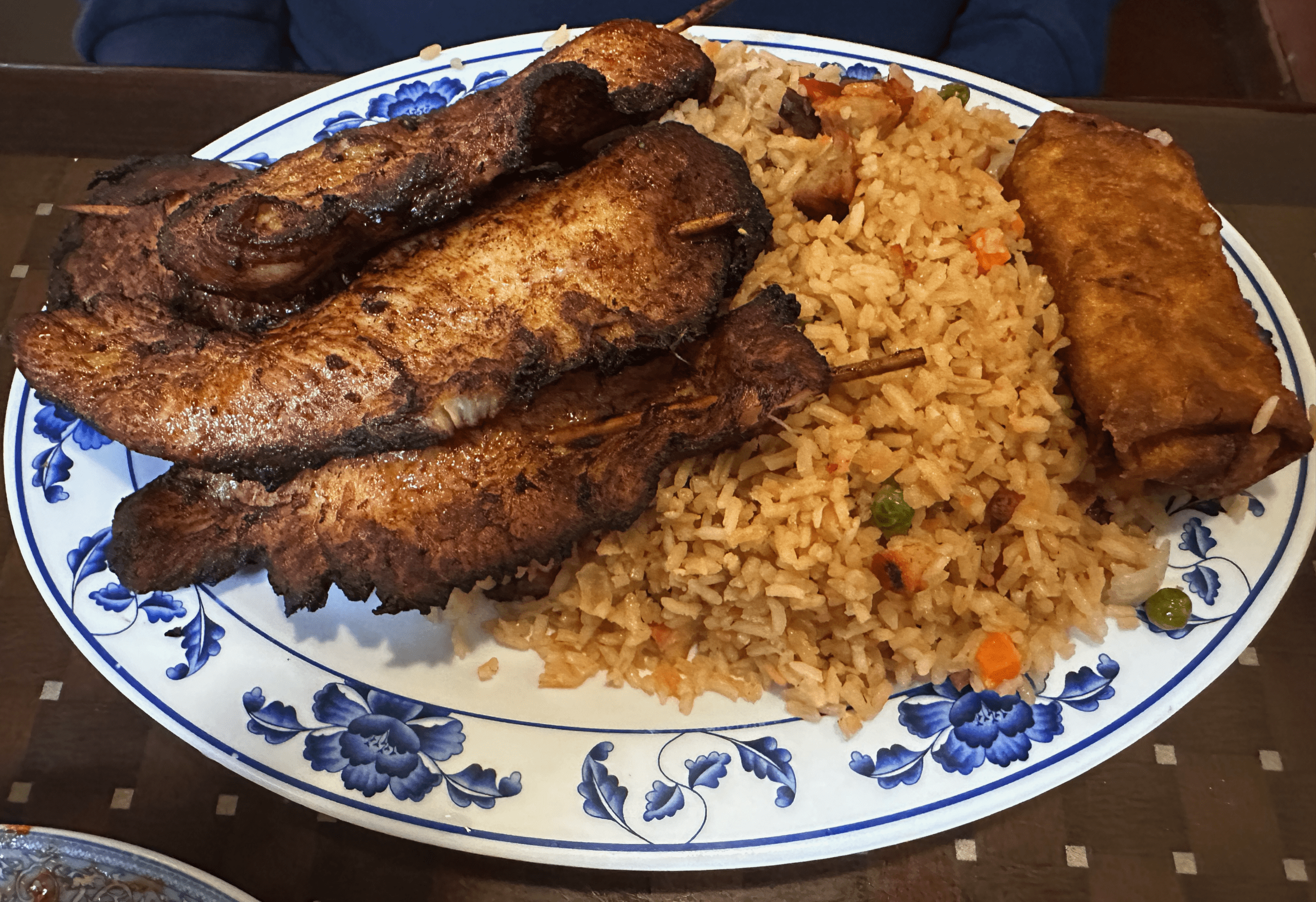 12 January 2026: Every once in a while when we don’t feel like cooking or going too far to dine out, my Kim asks me to pick up teriyaki chicken from Panda Express. Aargh! What I do for my Kim! For some reason, she only likes Panda Express’s version. She won’t order teriyaki chicken anywhere else…until our visit to Best Lee’s. Instead of the usual bite-sized bits of overly sauced (lacquered) sauce, the teriyaki chicken arrived on skewers similar to Thai satay. Sadly, the chicken was on the desiccated side and not nearly sauced enough for my sweet-toothed bride. She loved the fried rice and agreed with me that the egg roll was beyond mediocre.