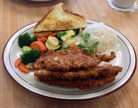 21 April 2013: That approach is how we wound up ordering chicken tenders. My sixty-something friend and former Intel colleague Mike Muller considers chicken tenders a last great act of defiance against growing old. They’re one of his favorite dishes. My Kim and I, on the other hand, tend to equate them with McNuggets, a nasty amalgam of sheer, shameful yuck. When we saw large pieces of boneless chicken headed to an adjacent table, we knew these were not of the Golden Arches ilk. Vic’s slices chicken breasts into strips and coats them with a very flavorful batter that renders the exterior crisp while leaving the chicken moist, tender and absolutely delicious. They’re better than the fried chicken at most restaurants. The chicken tenders are served with real mashed potatoes and gravy.