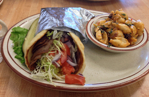 21 April 2013: While the nearby mega church may warn against coveting anything that is your neighbors, at Vic’s Daily Cafe it’s a daily occurrence. Whether you call it covetousness or sheer lust, watching a plate of gyros make their way to your neighbor’s table will probably mean you’ll order gyros yourself. It’s a good choice. A large pita is the canvas for a thinly sliced beef and lamb amalgam, chopped tomatoes, red onions, lettuce and tzadziki sauce. It’s a very good gyro with high-quality ingredients. The gyros are served with your choice of one side. Ask for the Greek pasta salad which is made with feta cheese, olive oil, Kalamata olives, tomatoes, cucumbers and pepperoncini. It’s a winner.