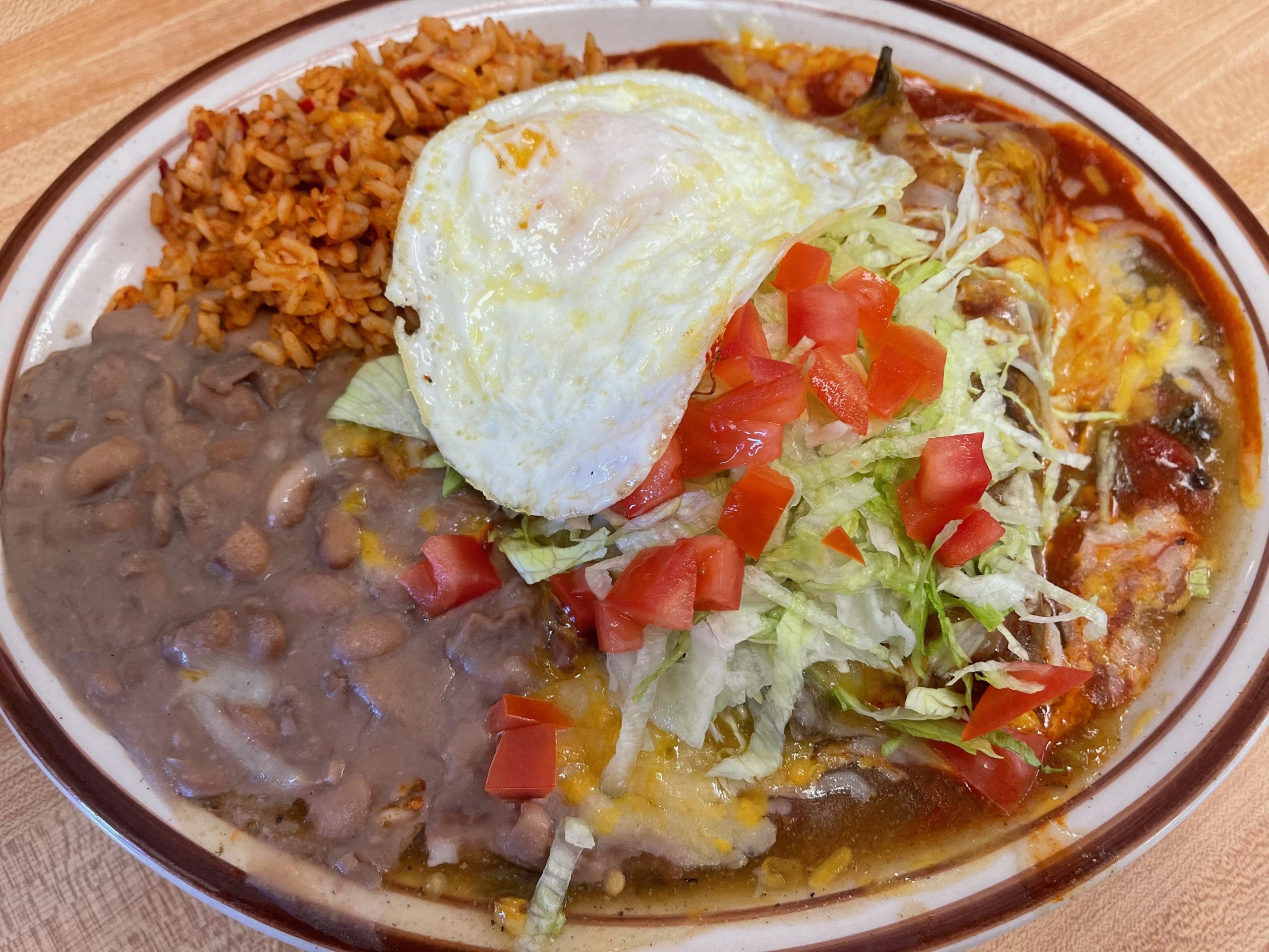 26 June 2018: The New Mexican Favorites menu lists eleven items all served with beans, rice, lettuce and tomatoes. Favorites is an apropos term. That menu includes burritos, enchiladas, chili (SIC) rellenos, tacos, a tortilla burger and something called the S.O.B (South of the Border). My favorite is the blue corn shredded beef enchiladas(with red or green chili sauce melted cheese, and egg of your choice) with an over easy egg. Though the chile registers at “mild” by my personal Scoville scale, it did bring a “how can you eat that” reaction from my Kim who thinks I’m a masochist. The shredded beef is roast beef quality and (not my imagination) includes gyros meat, a delicious surprise. For rolled enchiladas, these are pretty good.