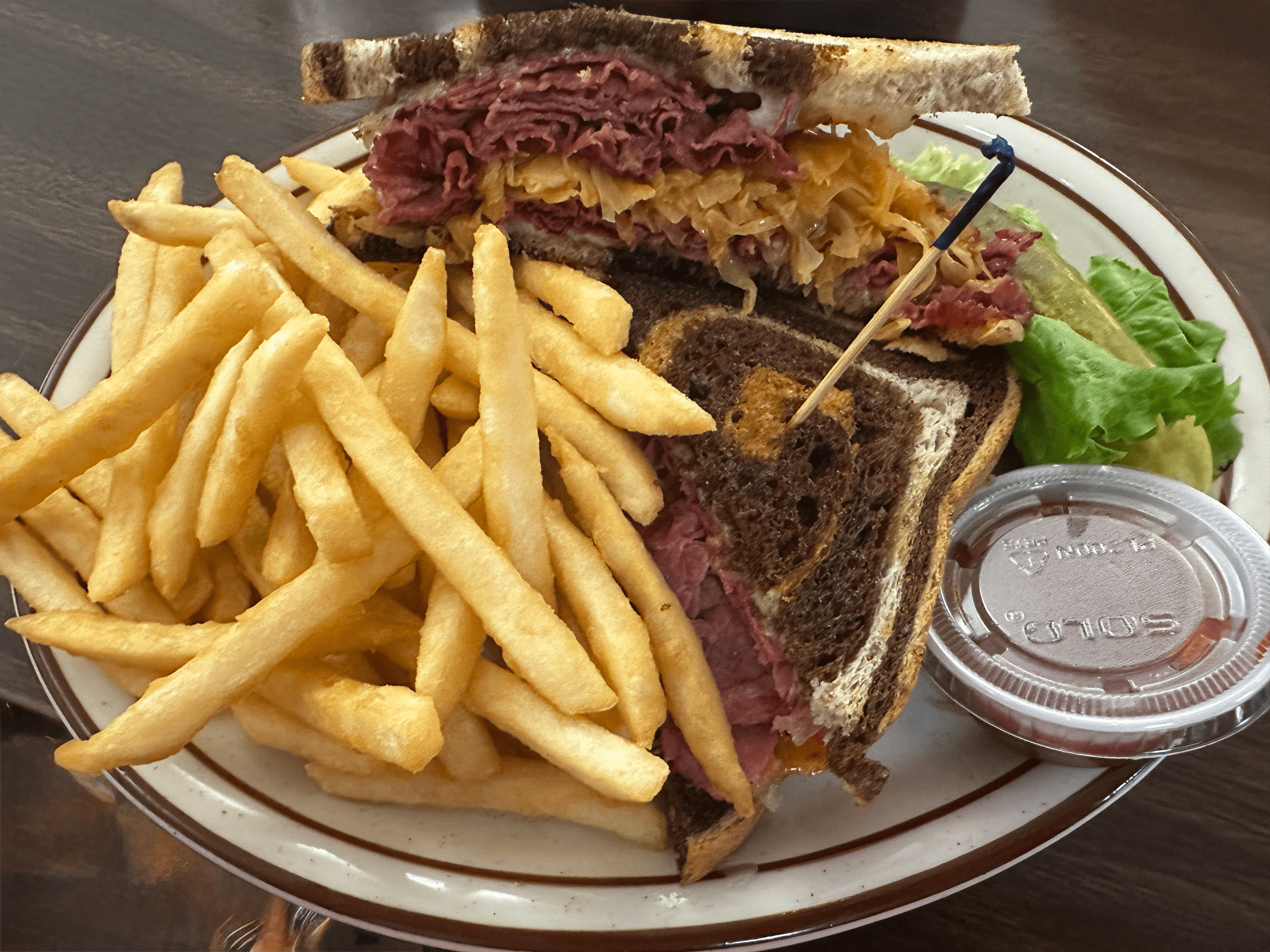 13 June 2025: In her wonderful novel Aftertaste: A Novel in Five Courses, author Meredith Mileti beautifully describes the enjoyment of a Reuben sandwich: “I devour the sandwich, a mountain of corned beef between two greasy slabs of marble rye, leaking cheese and Russian dressing all down the front of my sweater. It’s delicious, and I don’t stop eating until I’ve finished the last thick fry, which I use to mop up the remains of the sandwich.” She must have watched me eat the Reuben (shaved lean corned beef with Swiss cheese, sauerkraut and special dressing on grilled rye bread) at Vic’s Daily Cafe.