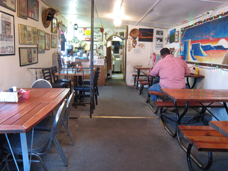 El Farolito occupies a simple adobe building that from the outside looks abandoned. In fact, if you’re even slightly exceeding the at-a-crawl speed limit of 25 miles per hour, you’ll miss the restaurant’s weathered plywood sign and will have to turn around and slow down to find the restaurant. Inside, seven picnic tables constitute El Farolito’s dining area. It’s certainly not ambiance that made this restaurant world famous. It’s the green chile which won the blue ribbon at the New Mexico state fair for three years running (1987-89) and was once named “best chile” by the International Chile Society.