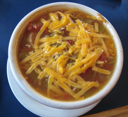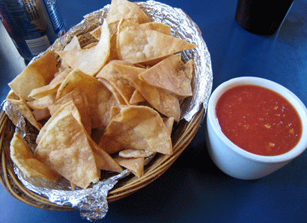 The salsa has a pureed texture, like a thick tomato soup. In fact, it’s got a similar rich red color to tomato soup. The salsa is just a bit runny and may run off the chips, but it’s a delicious salsa you’ll want to consume by the bowlful–make that, two or three bowls full. As in so many New Mexican restaurants, the salsa is the most piquant item on the menu and similar to an increasing number of restaurants, it’s not complimentary. Pay the pittance. It’s an excellent salsa. The chips are crisp and low in salt, formidable enough to scoop up Gil-sized portions of salsa.