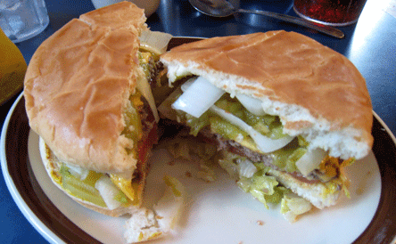 A green chile cheeseburger at El Farolito’s is not quite the size of a Frisbee, but it’s a handful. Stacked high in between two golden buns, one smeared with mustard, are crisp lettuce, fresh tomatoes, onions and New Mexico’s favorite fruit, green chile. The green chile isn’t especially piquant, but it has a nice flavor. It’s easy to see why so many people tread off-the-beaten-path for one of these delicious burgers. It’s one of the ten best green chile cheeseburgers in New Mexico, one very much reminiscent of the green chile cheeseburgers you’ll find at the annual parish fiestas in Northern New Mexico’s small villages.