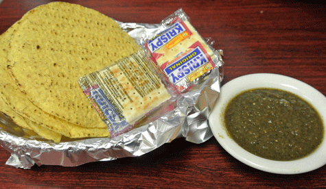 Not on the menu, but which was served gratis during our inaugural visit is a cup of shrimp consomme. Though it may have but one visible shrimp, the consomme is replete with the flavor of Mexico’s favorite decapod crustacean. This is not a soup for which a couple of cubes of “shrimp bouillon” are thrown into a pan of water and heated. Preparation is a painstaking process that involves not only deveining each shrimp, but grinding and mashing the shrimp skins and shrimp heads, both of which are used in the preparation of the broth. The consomme is quite good–better if enlivened with a few drops of the bottled habanero salsa on the table. Saltine crackers are also provided along with two crisp corn tortillas just beckoning for any of the bottled salsas on the table. Best of all, each meal comes with a basket of thick, steaming corn tortillas. They’re among the very best in the city.