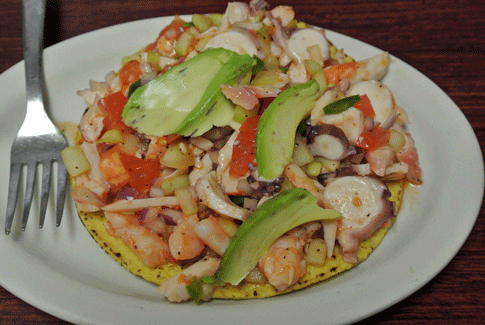 El Zarandeado is somewhat of an anomaly among mariscos restaurants in Albuquerque in that it offers both camaron crudo (raw shrimp) and camaron cocido (cooked shrimp) on its ceviche and tacos. The tostada de ceviche is available with shrimp, fish or any combination of two or three seafood ingredients, options of which also include pulpo (squid) and jaiba (imitation crab). As with most Mexican ceviche, each tostada is heaped with not only the seafood of your choice, but with chopped tomatoes, cilantro, slices of fresh avocado and a lime juice marinade which “cooks” the shrimp.