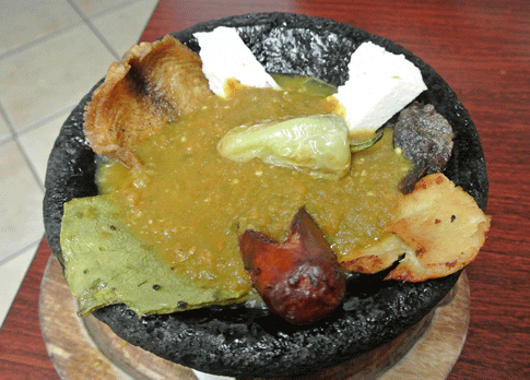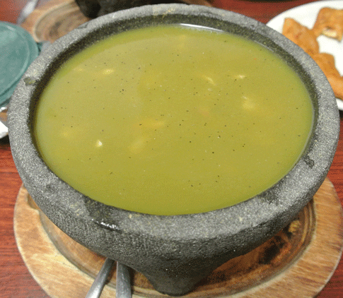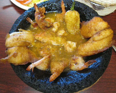 The dish which captivated both John Lucas and Andrea Lin is the Molcajete Sinaloense, one of three molcajete-based entrees on the menu. A molcajete is a three-legged cooking and serving vessel made from pure volcanic basalt. Not surprisingly, it retains heat very well. In fact, the contents with which the deep pucked cauldron is filled, remain every bit as hot when you finish your last bite as they were when the first bite burnt your tongue. The Molcajete Sinaloense includes three types of shrimp–Camarones Costa Azul, Camarones Empanizados and Camarones Al Mojo de Ajo–along with two butterflied fish filets and ringlets of octopus served in a mildly piquant green salsa served almost bubbling. This is an entree large enough for two, but so good you might not want to share it.
