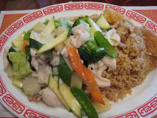 The menu, in fact, includes some items heretofore unseen (by these eyes anyway) in Duke City Chinese restaurants. Those surprises include cold jelly fish, sizzling rice soup, Westlake style beef soup, crystal chicken, sea cucumber in brown sauce and pork with leeks. Another surprise is several Korean items including Korean style short ribs, Korean style sweet and sour beef and even Kim Chi. Libations include a Shirley Temple and a Roy Rogers.