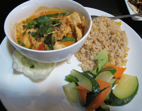 25 February 2012: My favorite entree is the Thai mango curry made with both mangoes and pineapples as well as bell peppers, bamboo shoots, onion, cashews, basil and a red curry coconut sauce. The curry has a nice balance of flavors–piquancy, sweetness, savoriness and tanginess and is served steaming hot. The vegetables are perfectly prepared– fresh and crisp. As with other entrees, it’s available with your choice of meat or shrimp. Alas, as with the Vietnamese vermicelli, the chicken is cut into long strips that are somewhat larger than bite-sized. The mango curry is available with your choice of rice and comes with steamed vegetables on the side.