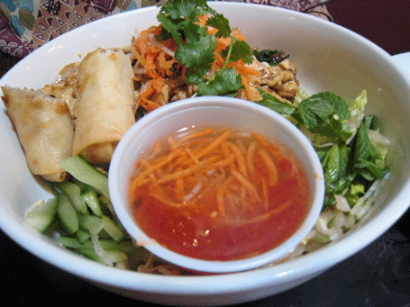 25 February 2012: The Vietnamese Vermicelli entree—vermicelli noodles, egg rolls, onions, cucumbers, lettuce, bean sprouts, carrots, mint, cilantro, scallions and crushed peanuts served with a chili lime vinaigrette–arrives in a swimming pool-sized bowl. The chili lime vinaigrette, served in a small ramekin, is reminiscent of Vietnamese fish sauce in that it is redolent with sweet, piquant and tangy elements. It’s a very good sauce which penetrates deeply into the fresh ingredients. This entree, from the Fried Rice/Noodle section of the menu, is served with your choice of vegetables and tofu, chicken, beef, pork, shrimp or combinations thereof. The chicken, mostly thigh meat, is moist and delicious, but is cut in long strips that are more than bite-sized. It’s the only downside to an otherwise good, fresh, healthful entree.