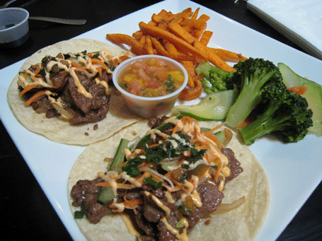 25 February 2012: In a surprising “Vietnam meets Mexico” twist reminiscent of the creativity found in China Poblano, the Signature section of the menu includes the Vietnamese Taco, an anomalous appetizer-sized entree melding the culture and cuisine of two diverse and distinct nations. Picture if you will, two corn tortillas engorged with your choice of grilled beef or chicken (you can’t have both), scallions, cucumbers, daikon, carrots and cilantro with Sriracha mayo. It’s unlike any taco you’ll find in Mexico. The corn tortillas are soft and oil free, bursting with contents. The tacos are served with a sweet-piquant mango salsa and sweet potato fries.