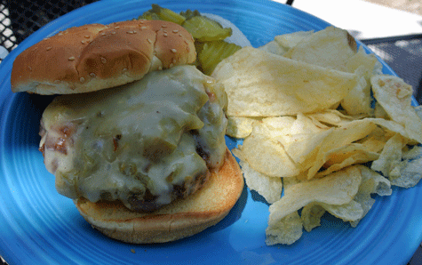 Of course nothing goes as well with shakes or malts as burgers and fries. The French fries don’t come from a bag, but are hand-cut Russets fried to a golden hue and salted lightly. These are fries so good you won’t need ketchup. There are several burgers on the menu, but in my ongoing quest for new “talent” for the New Mexico Green Chile Cheeseburger Trail, it was the Super Deluxe Burger which most beckoned. This burger behemoth is constructed from a five-ounce, hand-formed beef patty topped with bacon, green chile and cheese on a toasted sesame seed bun with white onions, pickles and tomatoes on the side. The chile is somewhat on the mild side, but it has a nicely seasoned flavor. The beef patty is moist and delicious, obviously not subjected to the torturous spatula press.