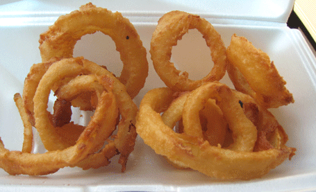 The onion rings are a mix of small, thick onion ringlets and large, oblong rings all battered lightly and fried to a golden hue. Served in a Styrofoam box, they’ll burn your tongue until you let them cool off. Alas, there aren’t a lot of them to go around. A better bet is an order of fries and an order of rings.