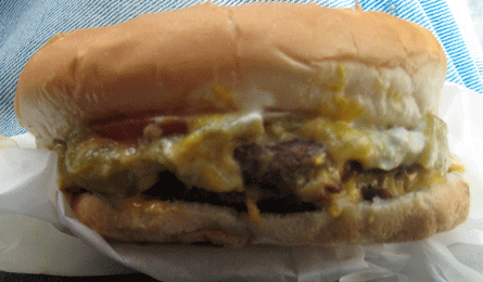 The double-cheeseburger is a half-pound patty double meat, double cheese burger with onions, pickles, tomatoes, mustard, mayo and ketchup. That triumvirate of condiments–mustard, mayo and ketchup–is fairly uncommon as a standard offering, but it’s a combination that works well. Of course you’ll want green chile to truly crown the burger with greatness. If you’re a cheese fanatic, you’ll also appreciate that the cheese drapes over the beef like a molten lava flow. The beef patties extend to the entire circumference of the buns.