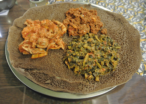11 January 2014: If you’ve never had the opportunity to enjoy Ethiopian cuisine, especially injera, you’re in for a treat. Injera (pronounced in-jeer-ah) is a thin, crepe like bread with a not-so-subtle to very subtle sourdough-like taste depending on how much teff (the smallest grain in the world) is used in its preparation. Ethiopian meals are typically eaten by tearing off a piece of injera with your hands (an experience that may remind you of tearing fabric) then scooping up your vegetables and meats with it (very similarly to how native New Mexicans use tortillas).