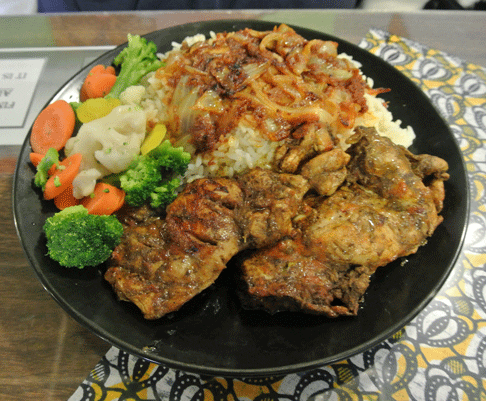 17 March 2012: The menu isn’t entirely West African. A selection of Caribbean dishes is also available on the Talking Drums menu and that, too, makes sense considering how many people were transported as slaves from West Africa to the Caribbean and how ingredients indigenous to the Caribbean were transported back to West Africa. The most obvious commonality is the use of piquant chiles which were introduced to West Africa by the Portuguese in the 16th century. Almost synonymous with Caribbean cuisine is the term “jerk’ which describes the seasoning and preparation of meats in a style originated in Jamaica. The meat is first marinated for hours in a spicy blend of peppers, scallion, thyme and pimento seeds then cooked over an outdoor pit lined with pimento wood over low heat. The low heat allows the meat to cook slowly, retaining its natural juices which are infused with the flavor of spices and wood.