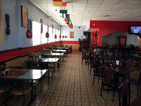 For its first three and a half years of operation, Talking Drums was located on San Pedro just north of Gibson and next door to Cervantes, a long-time purveyor of incendiary chiles. In July, 2015, Talking Drums relocated to Central Avenue just west of the University of New Mexico. UNM students, who tend to be very broad-mined, will love it! As at its previous home, the restaurant’s walls are festooned with colorful African art, including one portraying an elderly African woman lacing the skin on a pair of drums. The flags of West African nations fly from the ceiling.