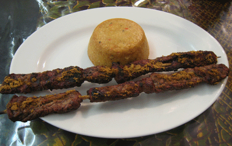 17 March 2012: Alex also sold us on African spiced suya,essentially a Nigerian shish kebab (roasted skewered meat) with a peanut-spice rub. In Nigeria, it is offered both in restaurants and by street vendors and is a favorite national snack. It bears little semblance to Thai and Malaysian satay which is typically served with a sweet peanut sauce. The peanut-spice rub used on suya is savory with pronounced heat generated by cayenne peppers and other spices. At first bite, the meat may seem a bit dry, but that’s just the presence of spices talking. Flavor-wise, the meat is reminiscent of a terrific beef jerky with a complex spice flavor.