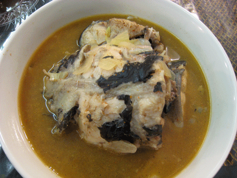 17 March 2012: Among the more intriguing items on the menu are pepper soup meals, a traditional Nigerian specialty as esteemed and beloved in Nigeria as chicken or tomato soup are in the United States. Despite the name and prominence of piquancy, peppers are far from the only component of this dish. A mixture of local (to Africa) herbs and spices lend the qualities of pungency, fragrance and herbaceousness. By itself, the broth is fantastic, as wonderful as any broth on any soup we’ve had in New Mexico, but this isn’t solely a broth-based soup. Three options are available: assorted meat (including tripe and entrails, goat meat and fresh fish. The fresh fish is a thick and meaty catfish served in its entirety head to tail (don’t dare turn down the catfish head which is replete with flavor). Plucking the fish from the scales is an easy and delicious adventure considering how well the fish is prepared. This is a Souper Bowl award-winning quality elixir!
