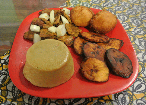 17 March 2012: As Alex was explaining the appetizers to us, the one which seemed to excite him most was something called moin moin. We couldn’t help but be caught up in his excitement for this traditional Nigerian steamed bean dish made from a mixture of black-eyed beans, onions and freshly ground peppers then served in a single-portion timbale shape. Texturally, it is similar to Thanksgiving dressing, but more dense. Tiny red flecks of piquant peppers foretell the light heat emanating from this small, but delicious appetizer. It’s no wonder Alex enjoys this dish so much.