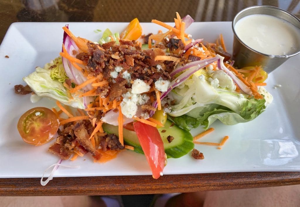 12 July 2020: Tempting as the appetizers may be, six salads say you’ll at least consider them as an introduction to your meal. Each of the six is an exemplar of combining quality ingredients to optimize concordance in taste, texture and appearance. Our choice was the baby wedge (cherry heirloom tomato, hot house cucumber, red onion, shredded carrots, crispy bacon bits, Maytag blue cheese and classic blue cheese dressing), a salad which itself has earned the distinction “vintage.” The wedge salad dates back to 1916 when it appeared in a book titled “Salads, Sandwiches & Chafing Dish Recipes” by Marion Harris Neil.