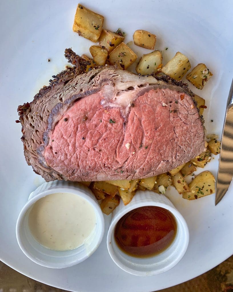 12 July 2020: “Brutally honest” English restaurant critic Jay Rayner tells it like it is: “A well-done steak isn’t a food choice: it’s a crime.” That may be especially true about prime rib, an extremely tender rib primal cut. Any more than medium-rare and prime rib loses the tenderness for which it is cherished. Kudos to the Vintage 423 kitchen staff for being on their A-game and serving a perfectly pink, nicely marbled and thoroughly tender prime rib with a flavor-packed spiced seared crust. This melt-in-your-mouth prime rib tastes just as amazing as it looks. The Vintage spiced roasted prime rib is served with duck fat potatoes as well as ramekins of au jus and horseradish sauce.