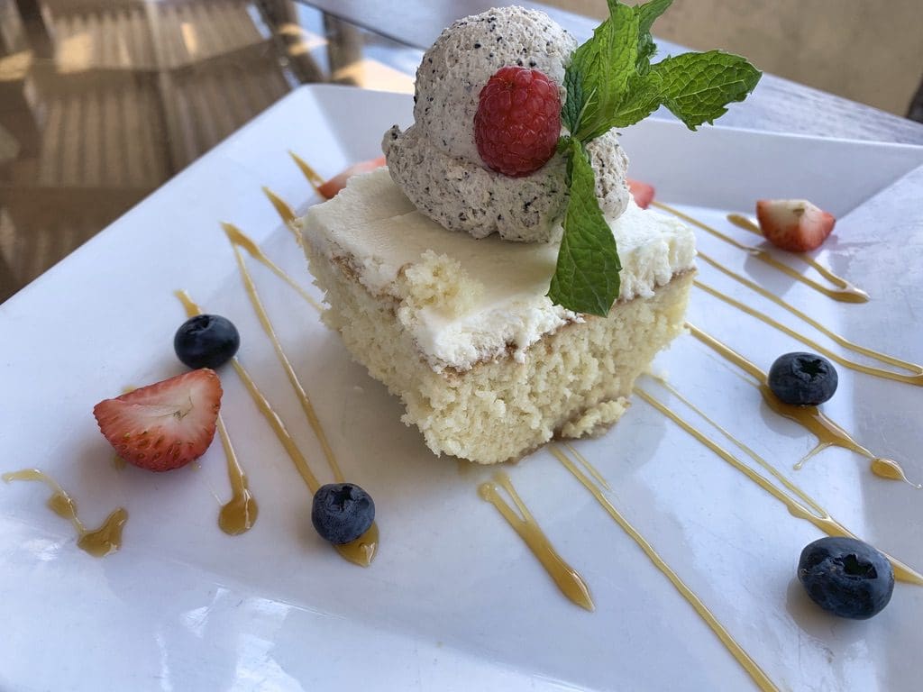 12 July 2020: Five desserts grace the Vintage 423 menu. You can certainly never go wrong with Tres Leches Cake, the favorite of our sweet server who assured me I’d love it. While moist and tender, it wasn’t oozing the three milks with which Mexican kitchens have been preparing this cake for generations. Its saving grace was an espresso cream sauce topping rich with the flavor notes that make coffee my very favorite adult beverage.