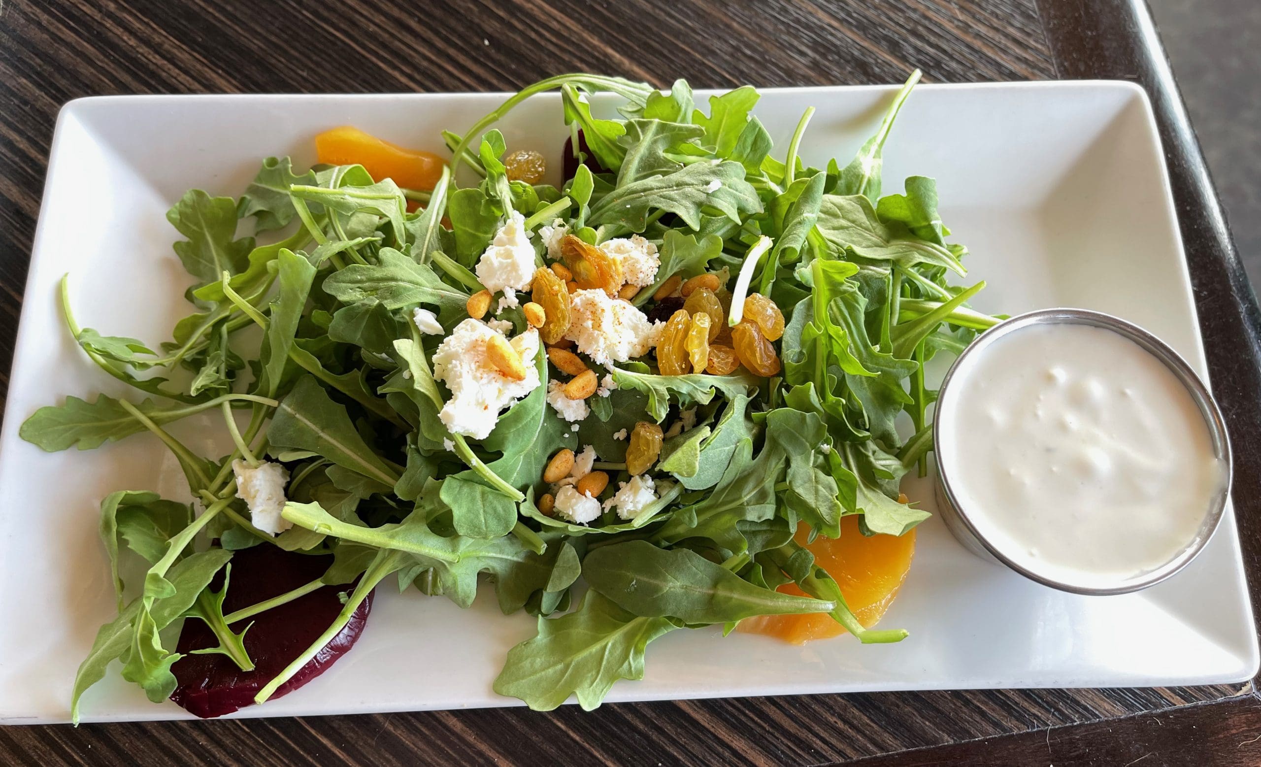 18 September 2021: Here’s a trivia question for you. Who’s the longest running real-life advertising character on network television? No, it’s not Tony the Tiger. It’s Maytag’s “ol’ lonely” repairman from an advertising campaign that’s more than 50-years-old. That’s almost as long as Maytag blue cheese has been produced…initially by the grandsons of the founder of the Maytag appliance company. It doesn’t matter what salad Vintage 423 offers, we always ask for Maytag blue cheese dressing and it does the job superbly. It sure did for the Roasted Baby Beet Salad (baby arugula, dried golden raisins, feta cheese, roasted piñon, baby beets). The beets in particular pair very well with the sharpness of the Maytag blue cheese.