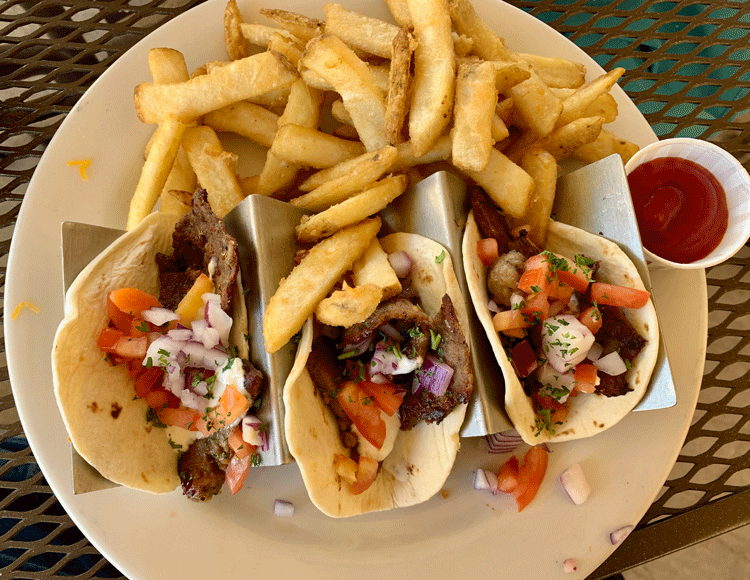 29 September 2019: Considering El Patron’s ownership pedigree, it shouldn’t surprise you to find a “New Mexico meets Greece” entree on the Sunday brunch menu. It’s a match of complementary culinary heritages, a match we found both creative and surprising. Essentially what we had–Greek tacos (seasoned beef and lamb in a flour tortilla with onion, tomato and tzatziki sauce)–are gyros in which tortillas are substituted for pita. The tortillas don’t miss a beat though a more generous portion of tzatziki would have given the tacos much-needed moistness. Seasoned French fries are a pleasant accompaniment though we missed having Greek-style patates
