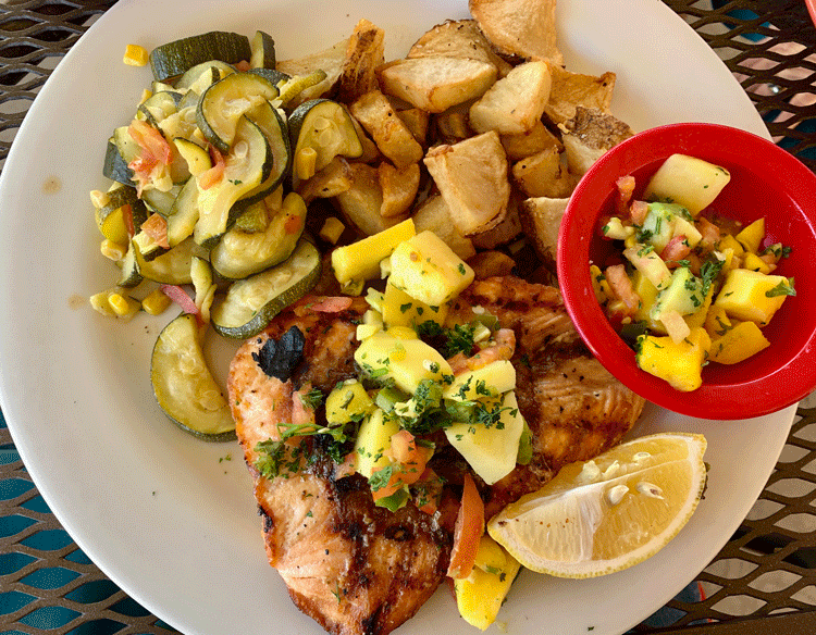 29 September 2019: There are three items on the seafood section of the menu: blackened tilapia, Parmesan sole and salmon a la Mexicana, an eight-ounce filet lightly seasoned and topped with an avocado-mango salsa. While salmon is not a seasonal dish, mango isn’t–or at least the mango used to create the avocado-mango salsa wasn’t. It lacked both the juiciness and sweetness of in-season mangoes. In fact, its flavor profile was more akin to pineapple, more tart than sweet. The avocado-mango salsa wasn’t bad, but there’s absolutely nothing as “tropical” and freshly delicious as in-season mangoes. It would have made a good salmon dish oh so much better.