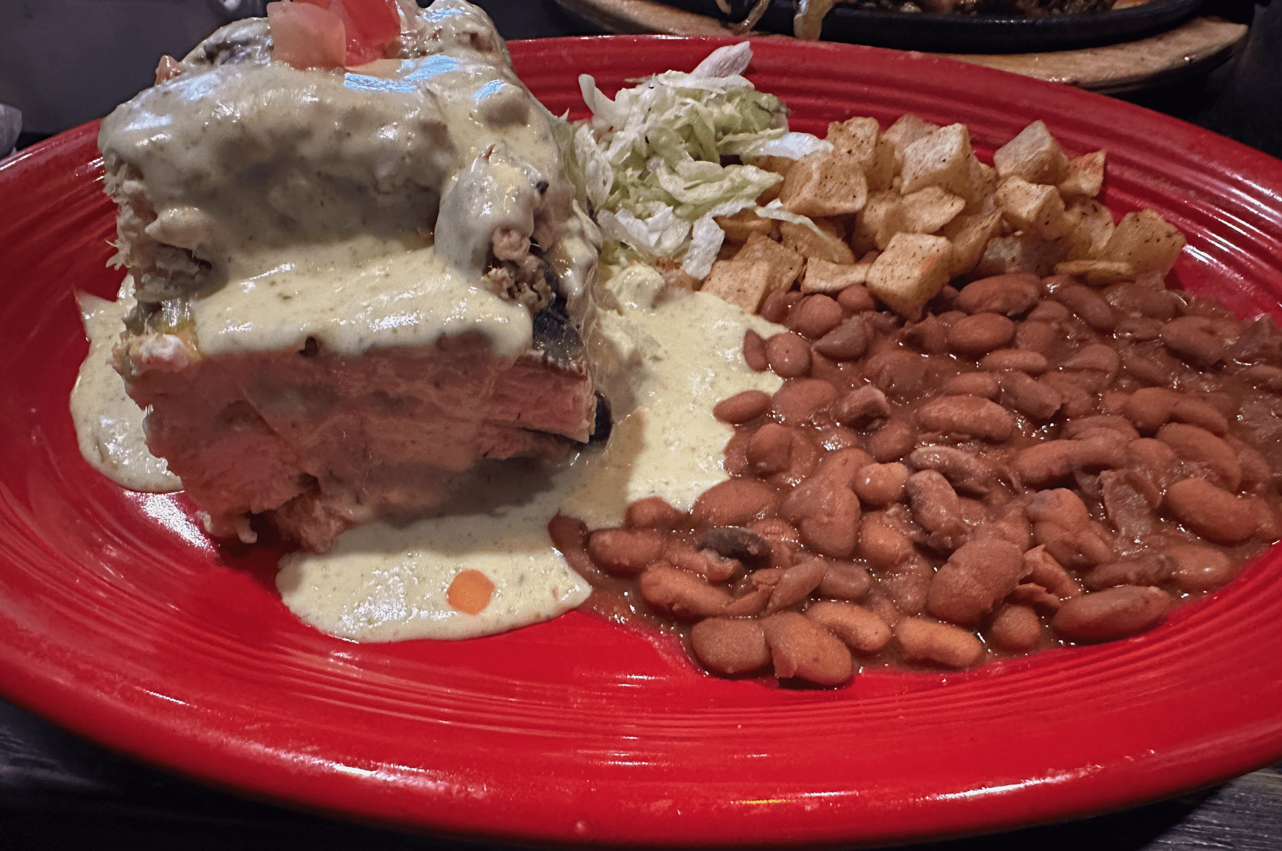 17 August 2025: Who the heck would visit a highly regarded New Mexican restaurant and order green chile chicken lasagna (layered with mushrooms, blend of cheeses, and serrano cream sauce. Served with pinto beans and rice). Hmm, maybe someone who’s more curious than George, someone who’s always looking out for new and exciting dishes. At first glance, the lasagna looks tall enough to rappel down from. It’s a humongous portion. Lasagna noodles are punctuated by stewed chicken that frankly mitigates the green chile. Serrano cream sauce wasn’t nearly enough for this fire-eater. Nor was it especially piquant.
