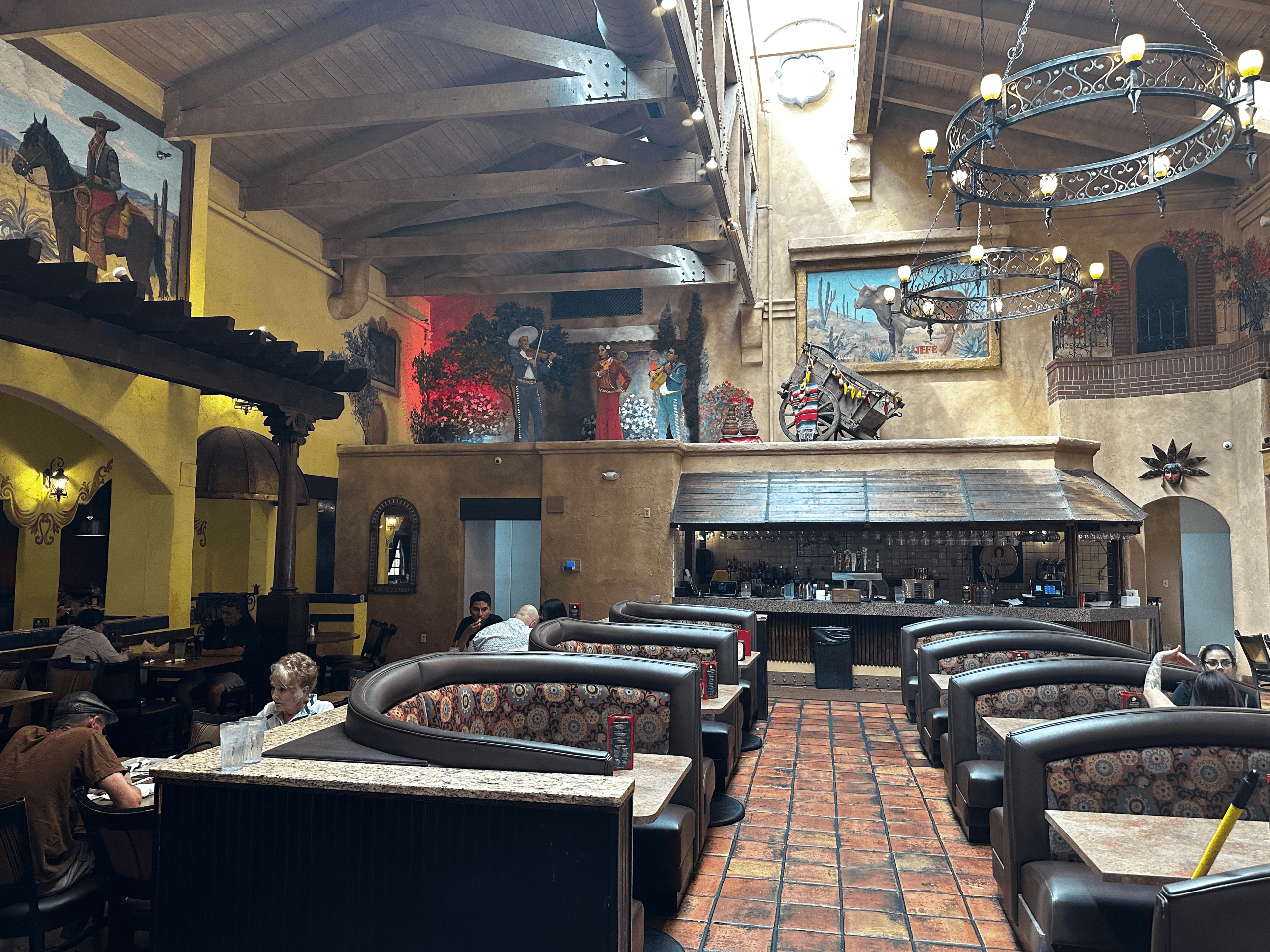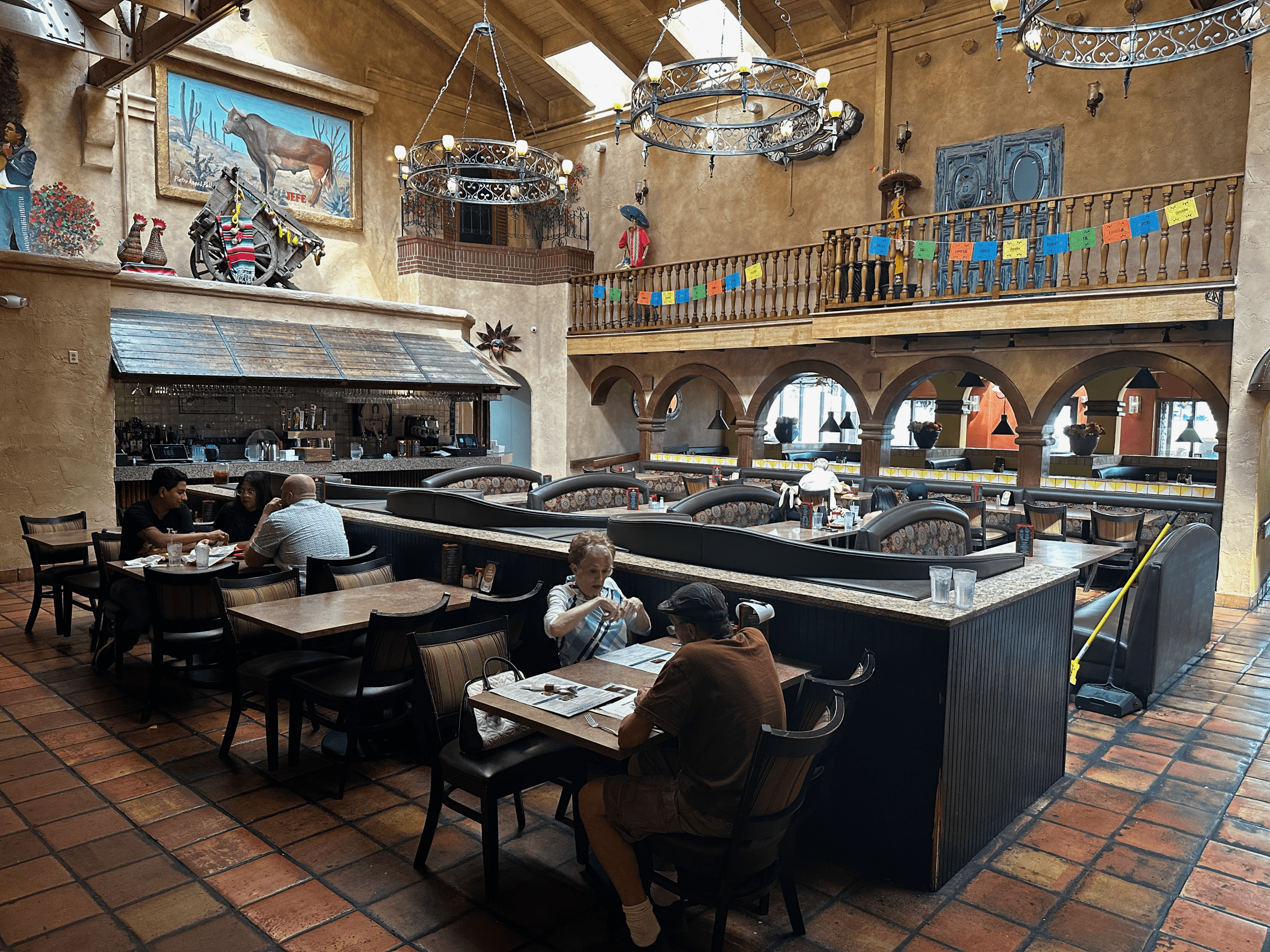 Step into the restaurant and it looks even more expansive than it does from the outside, if that’s possible. Even the foyer is capacious. The bar itself is larger than many restaurants. The main dining room is bathed in glorious New Mexico sunlight courtesy of strategically placed skylights. Perched on a ledge overlooking the dining room is a mannequin-like mariachi trio. Appropriately the music reverberating from the restaurant’s sound system is a “desfile de exitos,” compilation of corridos, rancheras and cumbias from some of Mexico’s most illustrious artists: Vicente Fernandez, Antonio Aguilar, Jose Alfredo Jimenez, Lola Beltran and more.