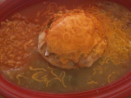 Another dish which could be better is the stuffed sopaipilla plate served Christmas style. As shown in the image above, both the red and green chile are almost soupy in their liquidity. So is the Spanish rice which practically swims in a tomato sauce. The whole pinto beans, on the other hand, are quite good as is the seasoned ground beef and bean combination engorging a single rounded sopaipilla. There are many options with which you can stuff the sopaipilla, including carne adovada. The sopaipilla, as with several entrees at La Casita, is topped with enough cheese to keep a family of mice happy for a month.