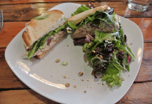 2 February 2014: Mention chicken salad sandwich among foodies and you’re likely to lull their taste buds to sleep. Chicken salad sandwiches aren’t widely noted for their taste appeal and are usually seen as more of a utilitarian offering, something you might serve if you’ve got left-over chicken and little time. Farm & Table has a gumption to believe it can improve on something so culinarily uninteresting–and according to my Kim, it does. Its components are celery, grapes, carrots, herbed mayo, farm greens and pecans on housemade toast. My Kim must really have enjoyed this chicken salad sandwich because she only gave me one small bite.