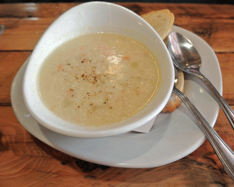 2 February 2014 (Brunch): Even in land-locked New Mexico, clam and seafood chowders have become fairly common. Most won’t ever be mistaken for chowders offered along the country’s coasts. In pairing black cod, one of ocean’s tastiest fish with parsnip, a mysterious root vegetable many people can’t identify, Farm & Table may have one-upped even some of coastal America’s best purveyors of sumptuous seafood soup. Black cod, also known as “sablefish” is a delicate, flaky fish with a rich, buttery flavor and silky sweet and rich overtones while parsnip is a root vegetable with a sweet, delicate flavor. This combination makes for a magnificent soup, one which will warm the cockles of your heart while tantalizing your taste buds. It doesn’t as much explode with flavor as it does offer your taste buds the warmth and comfort of soupy deliciousness.