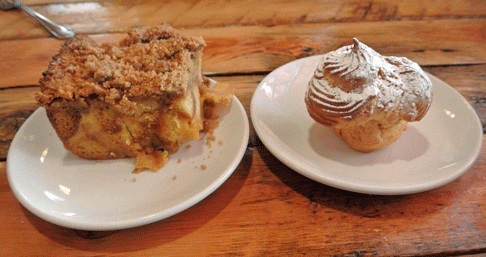 2 February 2014 (Brunch): The dessert against which I measure all other desserts is bread pudding. Farm & Table hasn’t disappointed in either of the two bread puddings we’ve sampled. One of the most unique is a Meyer Lemon bread pudding made from the house brioche and topped with a wonderfully crumbly streusel. Meyer lemons are juicy and sweet while retaining the tongue-tingling properties of conventional lemons. On the bread pudding it’s the sweetness that’s most prominent though just a touch of tartness sneaks in. The streusel is a wonderful touch, so much more commonly used on coffee cakes, but at home on this terrific bread pudding.