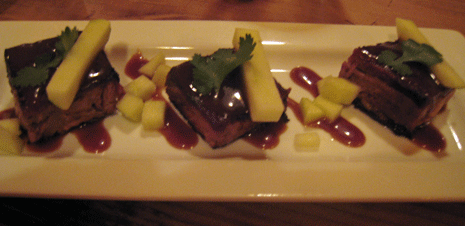 25 April 2012: Among the appetizers, the one that’s as impossible to resist as a dinner invitation from Franzi is the pork belly with butterscotch miso sauce. At first glance, the three petite pieces of porcine perfection resemble chocolate truffles, the sheen from the butterscotch akin to a glossy chocolate frosting. Far from being heart healthy, pork belly layers pork and fat together to provide a textural and flavor experience few foods can hope to match. In terms of flavor, think pulled pork meats bacon only better. It’s no wonder Emeril Lagasse likes to say “port fat rules!” The accompanying apple slices provide both a decorative touch and a flavor-texture contrast.