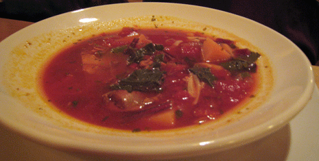 25 April 2012 (Dinner): Beethoven once said “only the pure of heart can make good soup.” The Farm & Table kitchen must then be staffed with a phalanx of pure-hearted cooks. The Italian soup is as good, if not better than most minestrone and pasta fagoli soups I’ve had in Italian restaurants. Aromatically enticing, it is replete with fresh vegetables and redolent with a coarse-blend sausage from Joe S. Sausage, the Duke City’s Scovie award-winning king of sausage. A vegan soup (beet root, kale, spinach and so much more) might be even better.