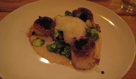 25 April 2012: Seafood aficionados will react to the local fig wood cold-smoked and seared scallops the way a treasure-hunter reacts to finding a pirate’s plunder. There are only three scallops on the plate, but they’re large and brimming with the sweet, succulent flavor that hearkens back to the days when scallops were synonymous with dining elegance. The scallops are topped with Balsamic caviar to lend a tangy contrast. A 2008 survey by Heinz shows that Brussels sprouts now take the prize as America’s most-hated vegetable. Perhaps it’s because respondents have never had truly great Brussels sprouts. Some of the very best we’ve ever had are the bacon Brussels sprouts at Farm & Table and not only because the bacon flavor shines through. These Brussels sprouts are perfectly prepared. They sit atop a white bean puree. An apple foam on the plate is cute, but superfluous.