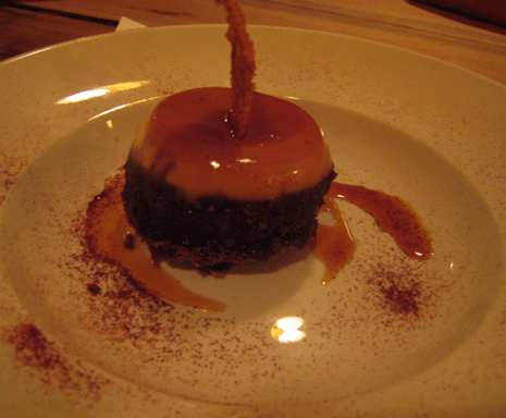 25 April 2012 (Dinner): While Franzi waxed eloquent about the entire menu, she was most enthusiastic about a dessert called Pastel Impossible (red chile chocolate cake with vanilla bean flan and spiced tortilla chip). Sometimes called chocoflan, it melds chocolate cake and flan both texturally and as an unbeatable taste combination. What is remarkable about this dish is that the chocolate cake and the flan are baked together, but are not mixed together. What’s more remarkable is just how good the combination can be.