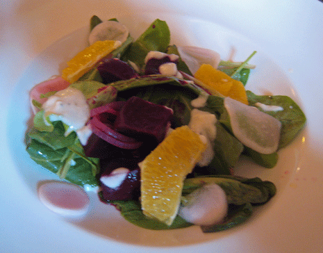 25 April 2012: What the dinner menu lacks in volume (only a handful of items plus specials), it more than makes up in the desirability of its entrees. You might think it would be relatively easy to pare down your one selection from the relatively small number of entrees, but you’ll be hard-pressed to do so. One safe bet is the grilled six-ounce beef tenderloin impregnated with a pungent blue cheese compound butter and served with horseradish mashed potatoes and roasted beets. If you’ve lamented the absence of a steak that will make your eyes roll back in sheer delight, you’ll love this tenderloin, emphasis on tender. At medium, it’s a foodgasm quality slab of beef. The horseradish mashed potatoes add a nice kick.