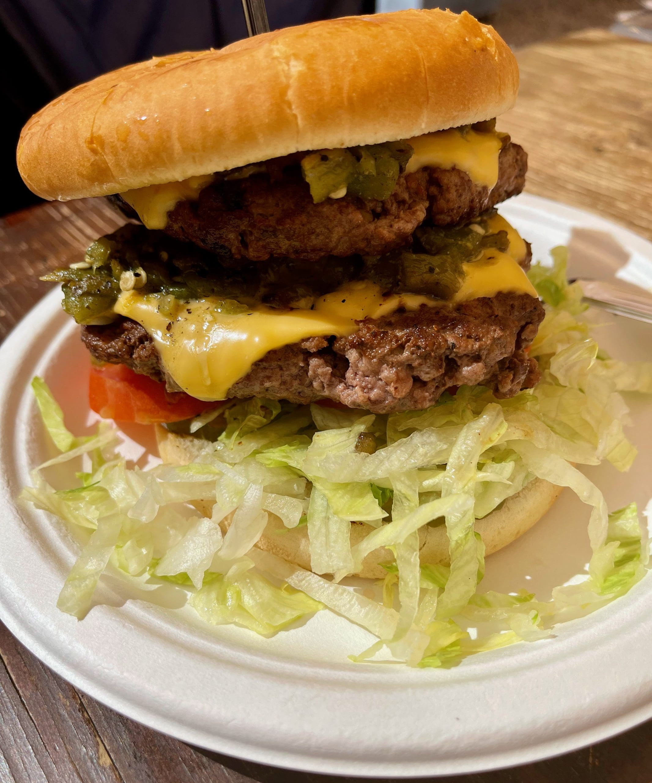 15 March 2022: For me, that means “The Mule,” a burger showcasing double-meat green chile patties weighing in at a whopping one-pound. Each mule comes with mustard, tomato, lettuce, chopped onion, pickles, cheese and ostensibly, green chile that packs a kick. (tourists certainly seem to think so according to our server). New Mexicans shouldn’t have any problem handling that green chile. Each patty on its own makes for a huge burger, easily big enough to share though you won’t want to. The beef used is 70 percent lean and 30 percent fat to give it a flavor as big as the stars that decorate night sky above the burger blessed town of San Antonio. The meat has long been pressed under a dinner plate, a family tradition that accounts for each burger’s uniformity.