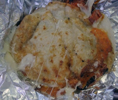 19 June 2014: The menu offers three “con queso” type entrees, all of them showcasing the grandeur and splendor that is the corn tortillas. The Chorizo Especial features melted cheese and chorizo between three of those corn-flavored orbs. For New Mexicans, the chorizo isn’t in ground form as we’re used to, instead resembling chopped wieners. No matter. They’re smoky, fatty and delicious, a perfect foil for the melted white cheese. The Chorizo Especial pairs especially well with the guacamole and the pico de gallo.