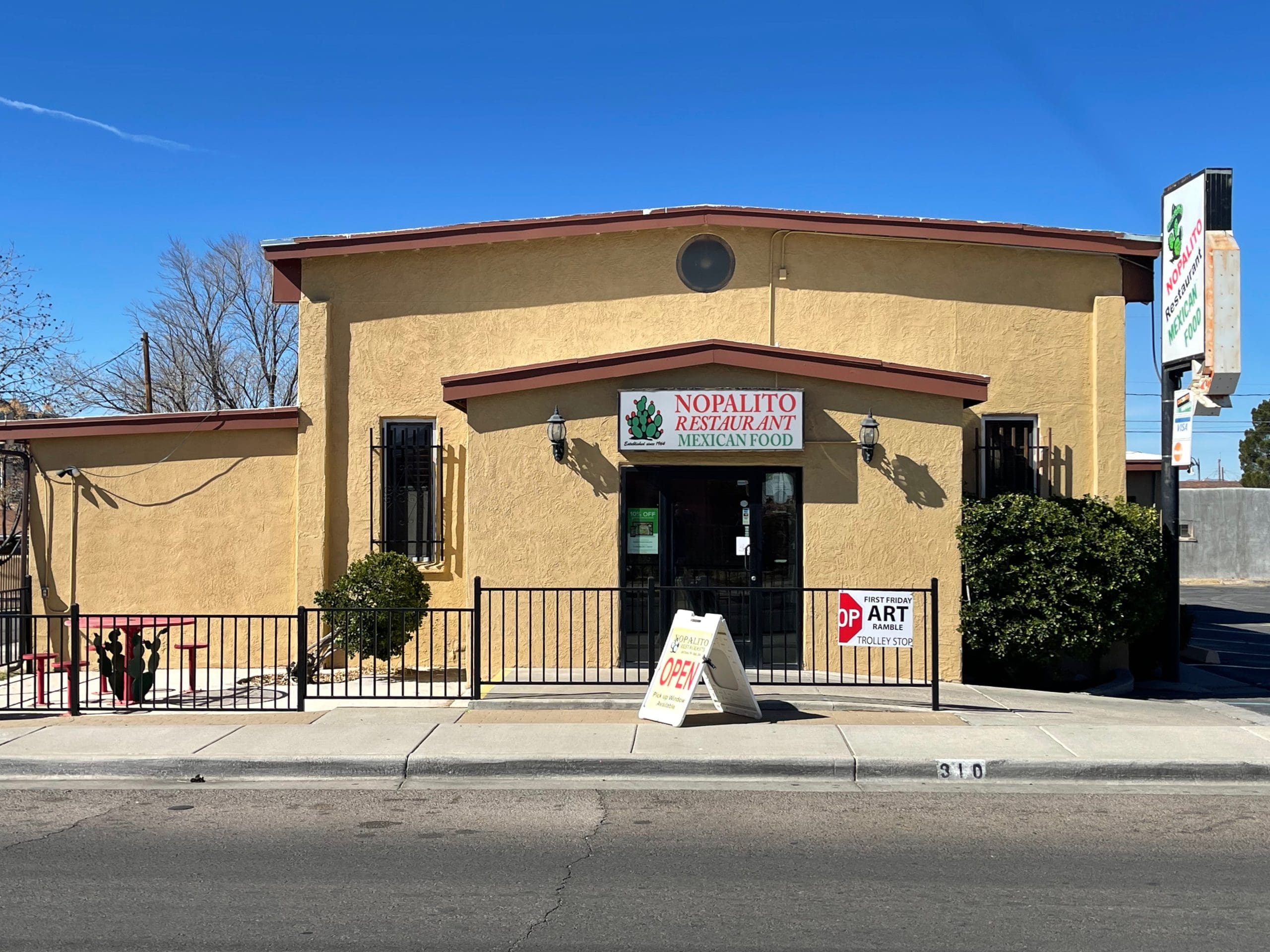 Nopalito is situated on Mesquite Street over a segment of El Camino Real de Tierra Adentro (Royal Road of the Interior), the historic trail that ran from Mexico City to Santa Fe. In 1974, Nopalito expanded, launching a second restaurant at 2605 Missouri, also in Las Cruces. It was built by the Gallegos Construction Company. In 2010, the Gallegos family opened the Nopalito Galleria to showcase regional art and provide the community with cultural enrichment through that art. Nopalito, by the way, translates from Spanish to an edible branch of various cacti of the prickly pear cactus family; it is commonly used as a vegetable.