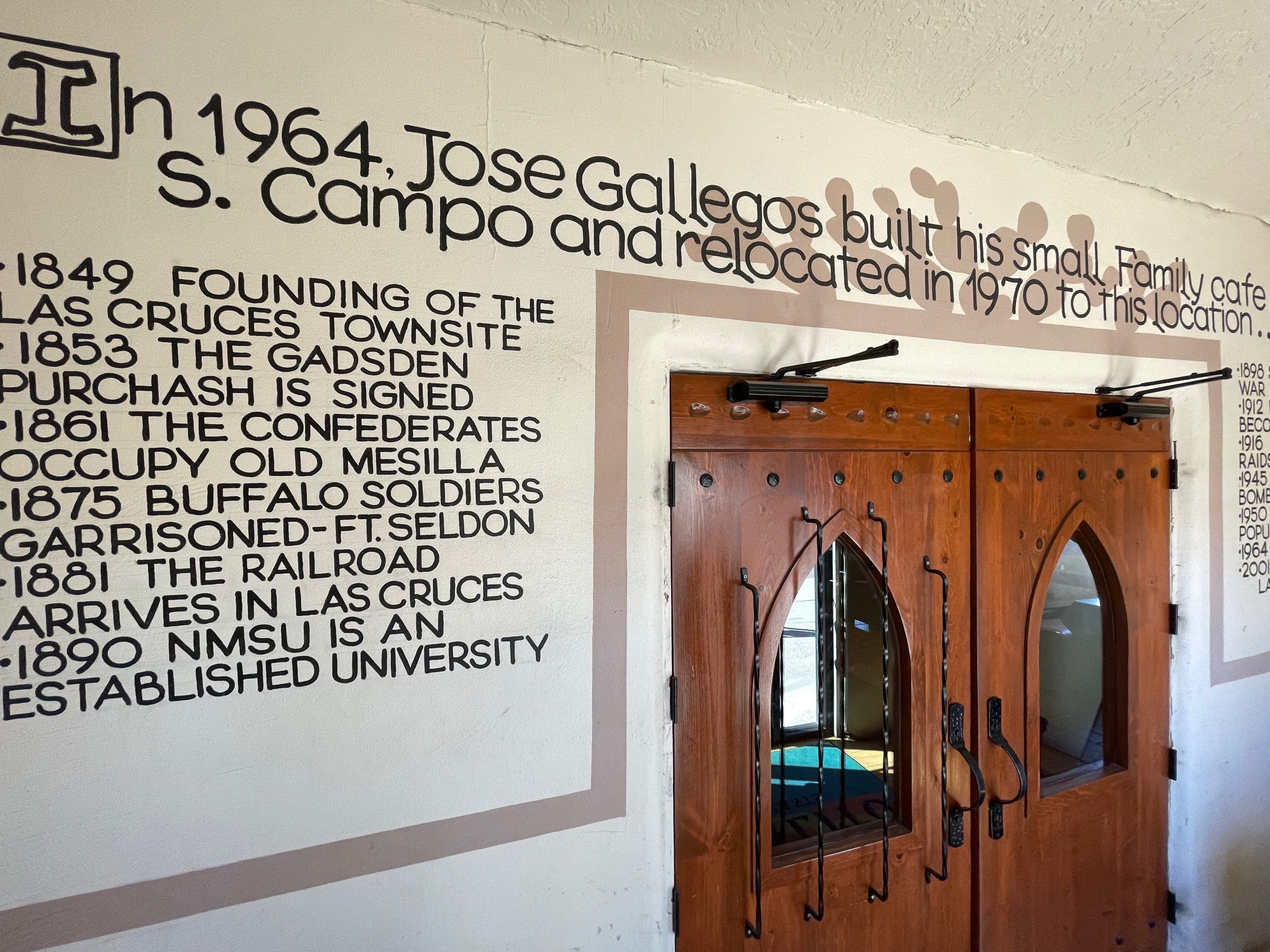 On the docket for family visits to Las Cruces were trips to these radical Mexican restaurants, all three of which we came to love as much for the assertiveness of their chile as for their quirkiness. At La Posta’s colorful lobby, for example, we gawked in wonder at the tropical birds and the state’s sole piranha. At Chope’s, we admired the pecan trees en route to the converted family restaurant. Nopalito had its own unique touches. It’s unlikely studying the history inscribed on the foyer walls will get you through History class at New Mexico State, but as a lifelong student of New Mexico history, it was quite intriguing to me.
