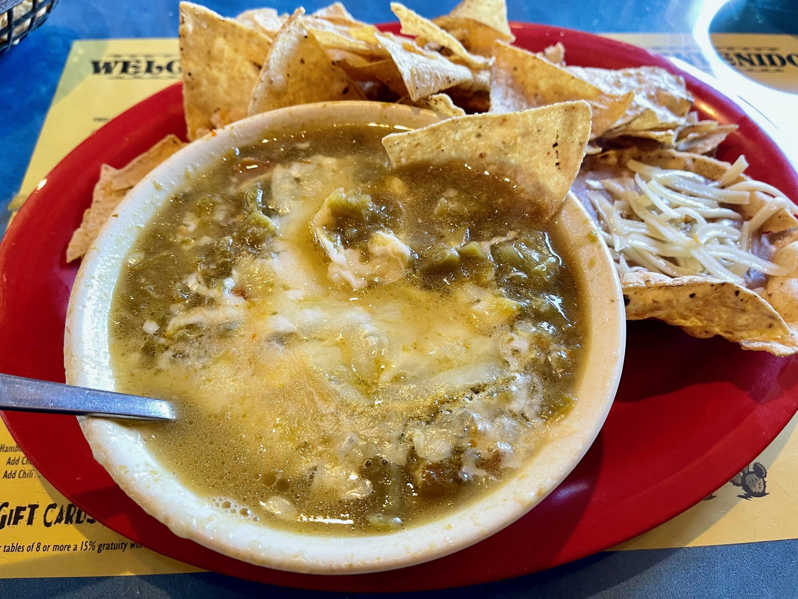 Despite the salsa, I remembered having really liked Nopalito’s unique con queso. Unlike most con queso which tends to be a mix of green chile, evaporated milk and Monterrey or Cheddar (or even (Heaven forbid) Velveeta), Nopalito’s version is akin to a bowl of green chile blanketed by a molten sheet of Muenster cheese. Yes, Muenster! I’ve long contended that Las Cruces area New Mexican restaurants serve the very best con queso in the state. If you need proof, visit Nopalito and La Posta. I’ve established just how good the green chile salsa is. The con queso may be even better. As with the salsa, the green chile isn’t especially piquant, but it’s delicious…and Muenster, with its Swiss cheese-like flavor, makes for a surprisingly good change.