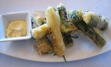 Jeff Beeman, the affable owner of the Casita de Chuparosa in Abiquiu, who reintroduced me to the O Eating House recommended a number of dishes he’s enjoyed during his visits to the O Eating House. Though by the time we arrived at the restaurant I had forgotten (my feeble memory again) what he had recommended, I did remember him using the word “fritti,” Italian for fried. As such we ordered a second starter, Zucchini Fritti (tempura-battered, flash-fried zucchini sticks tossed in Parmesan and parsley and served with a lemon aioli. Now, fried zucchini may sound so 1970ish, but Chef Lemon’s rendition is several orders of magnitude better than the pedestrian fried zucchini served at inferior restaurants. Unlike other fried zucchini we’ve had, this one is only lightly battered, allowing the freshness of the zucchini to shine. The zucchini is perfectly fried, remaining crispy and moist. The lemon aioli lends a nice tanginess.
