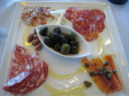 The antipasti also showcases fantastic fromage in the form of Il Saggio, a cellar-aged, robustly flavored goat’s milk cheese that’s both sweet and fragrant; and ricotta salata, an aged cheese made from lightly salted sheep’s milk curd. This cheese has a mild milky taste with a hint of nuttiness. It’s a good grating cheese, but great on its own. At the center of the antipasti platter is a small bowl of green and black olives flanked by a handful of almonds. The golden sheen from a light drizzle of olive oil on the plate is a decorative and delicious touch.
